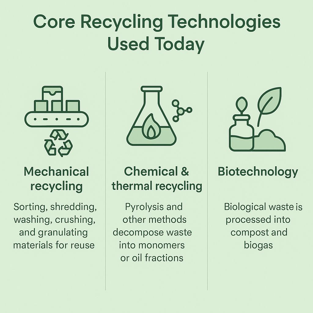 - Chemical and thermal recycling: Methods like pyrolysis and other technologies decompose waste into monomers or oil fractions, which can then be further used in the chemical industry.